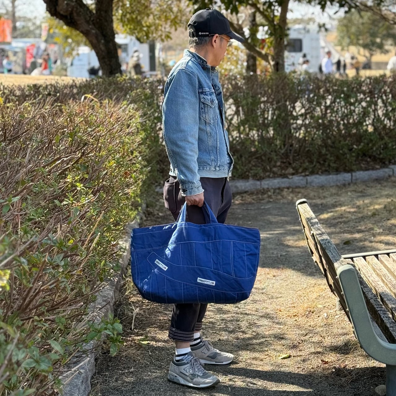 「もったいない」「再利用」「ひとつ使いましょう」「SDGs」などをコンセプトに。廃棄、不要になったツナギ、作業着、作業ズボン、古着屋さんに眠る衣服、その他生地類を丁寧に分解し、縫製の職人さんとクリエーターが再デザイン、大型のオリジナルトートバッグを完成させました。
