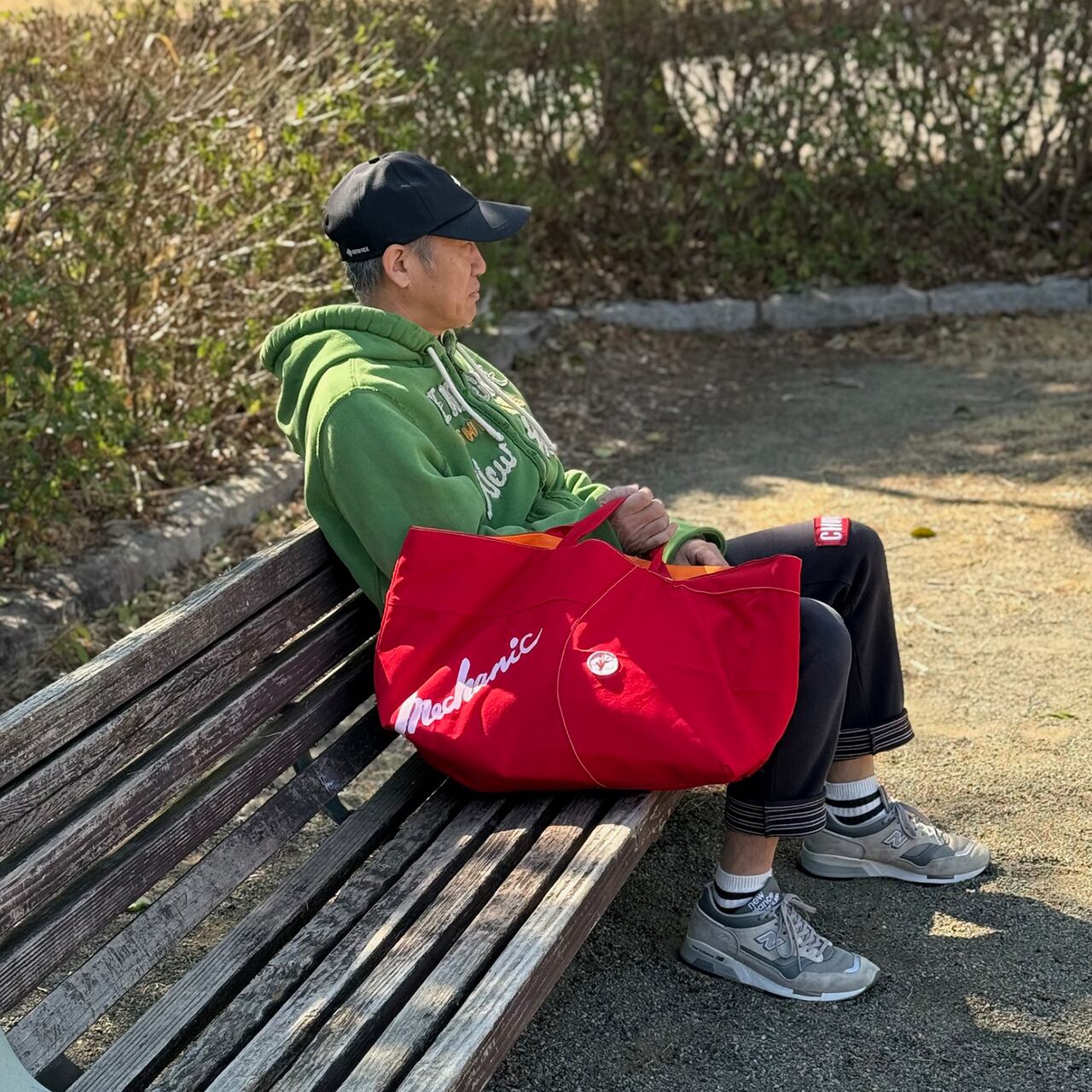 「もったいない」「再利用」「ひとつ使いましょう」「SDGs」などをコンセプトに。廃棄、不要になったツナギ、作業着、作業ズボン、古着屋さんに眠る衣服、その他生地類を丁寧に分解し、縫製の職人さんとクリエーターが再デザイン、大型のオリジナルトートバッグを完成させました。