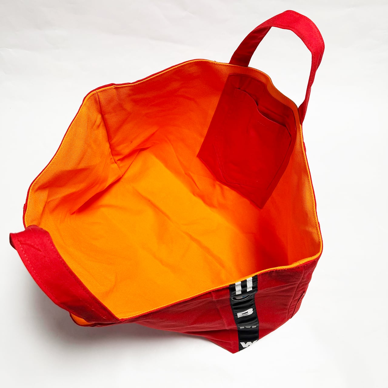 「もったいない」「再利用」「ひとつ使いましょう」「SDGs」などをコンセプトに。廃棄、不要になったツナギ、作業着、作業ズボン、古着屋さんに眠る衣服、その他生地類を丁寧に分解し、縫製の職人さんとクリエーターが再デザイン、大型のオリジナルトートバッグを完成させました。