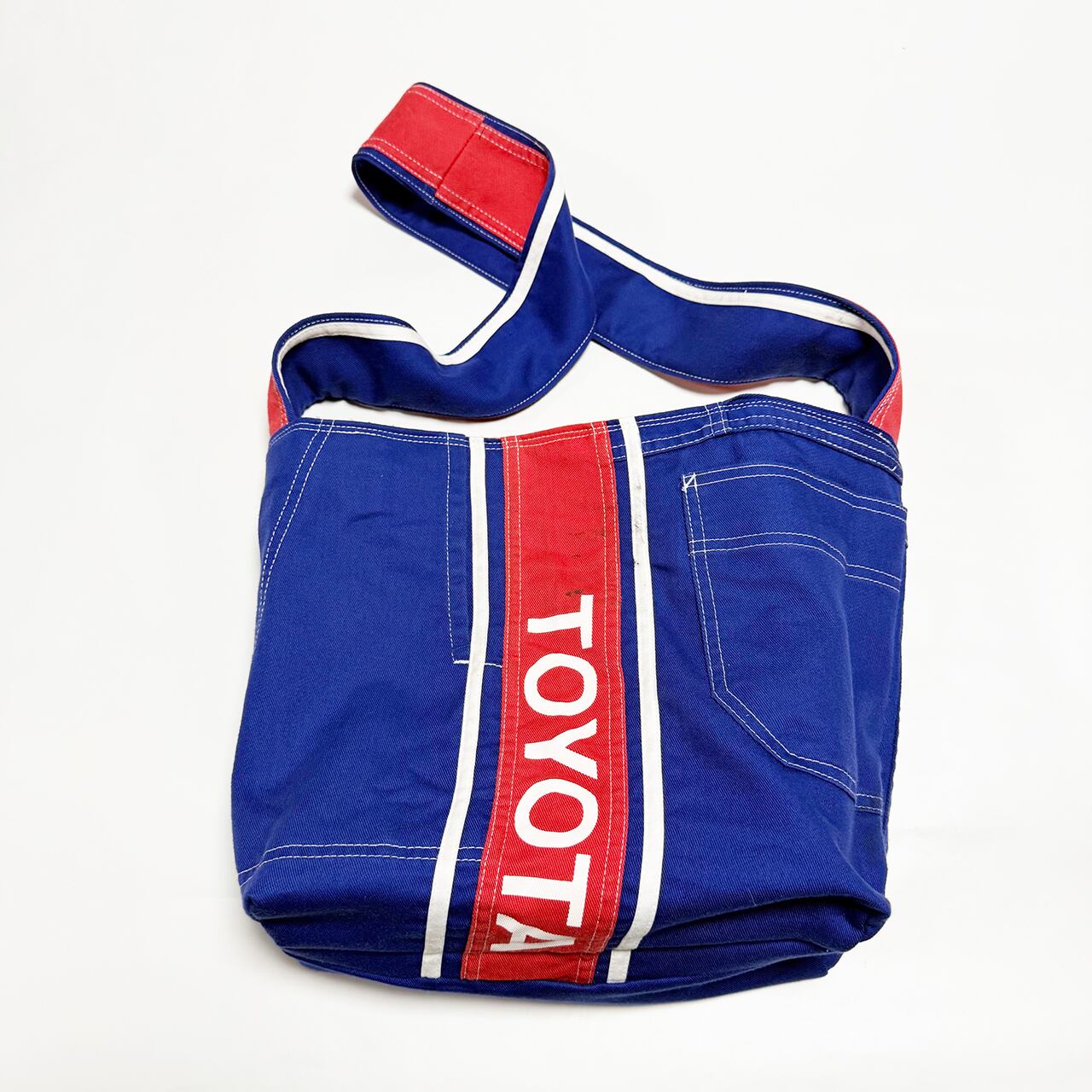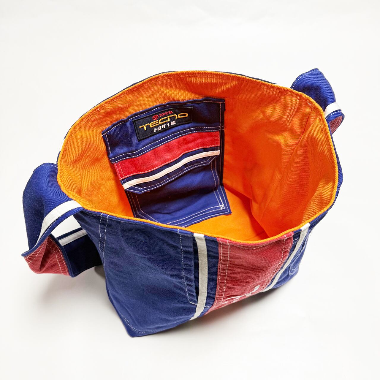 ・大型トートバッグ同様に、つなぎや作業着、レーシングスーツなどからリメイクしてています、もちろん裏地は厚手の頒布を使用しています、自立するトートバッグです。