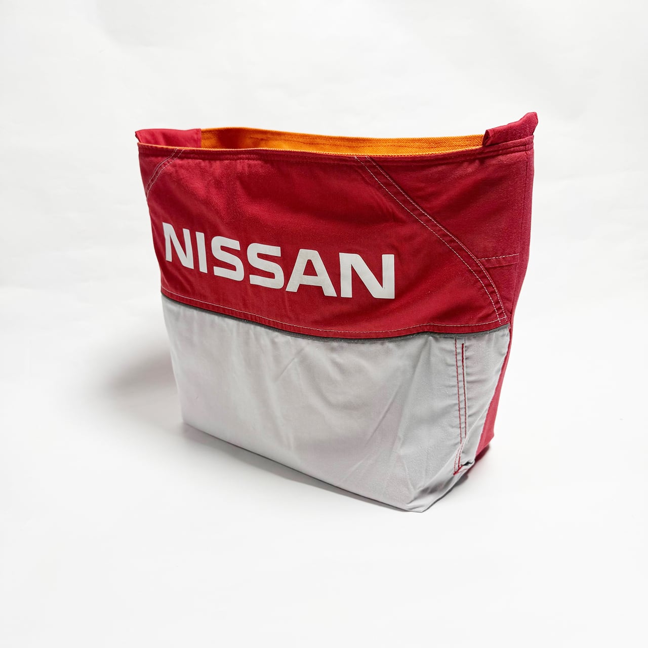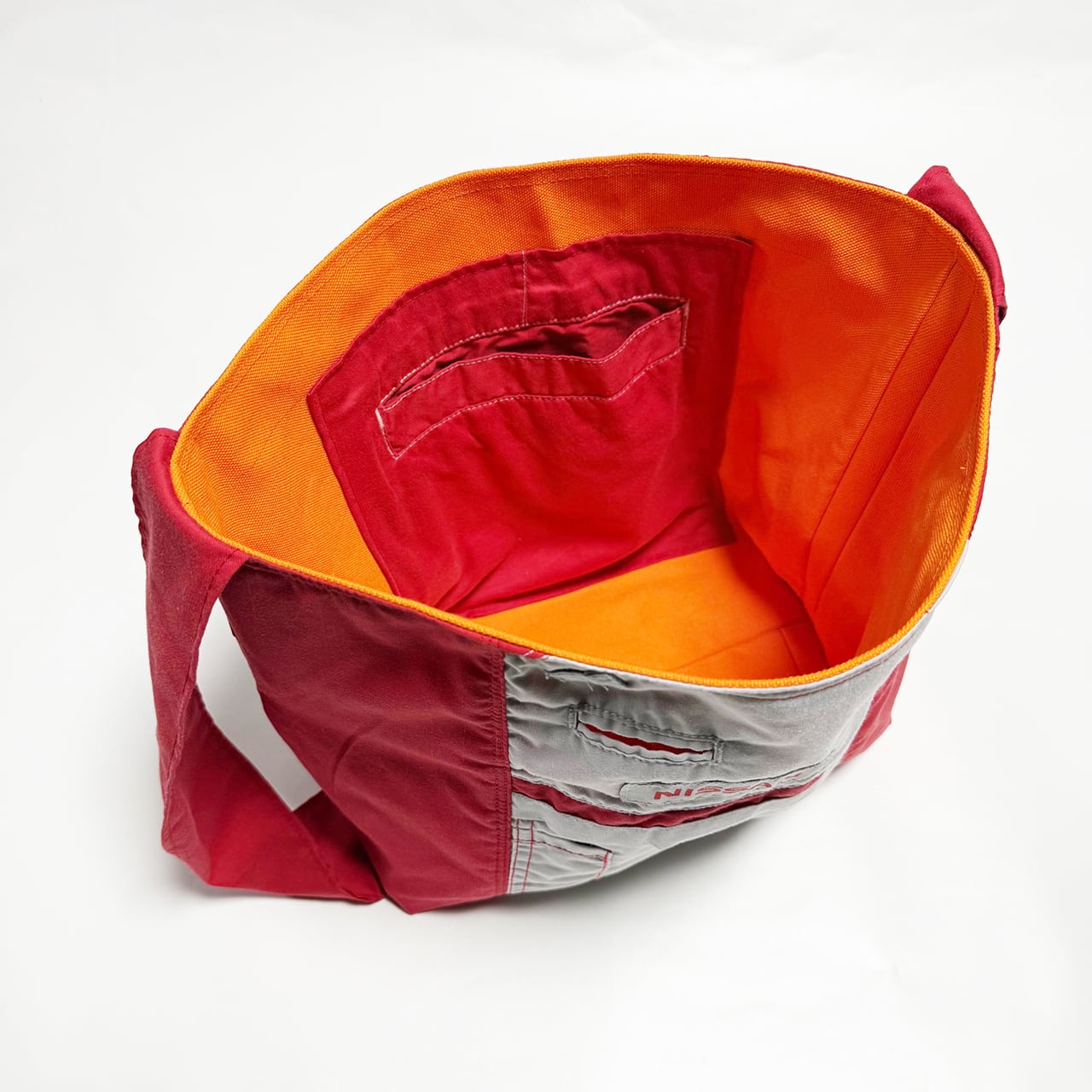 ・大型トートバッグ同様に、つなぎや作業着、レーシングスーツなどからリメイクしてています、もちろん裏地は厚手の頒布を使用しています、自立するトートバッグです。