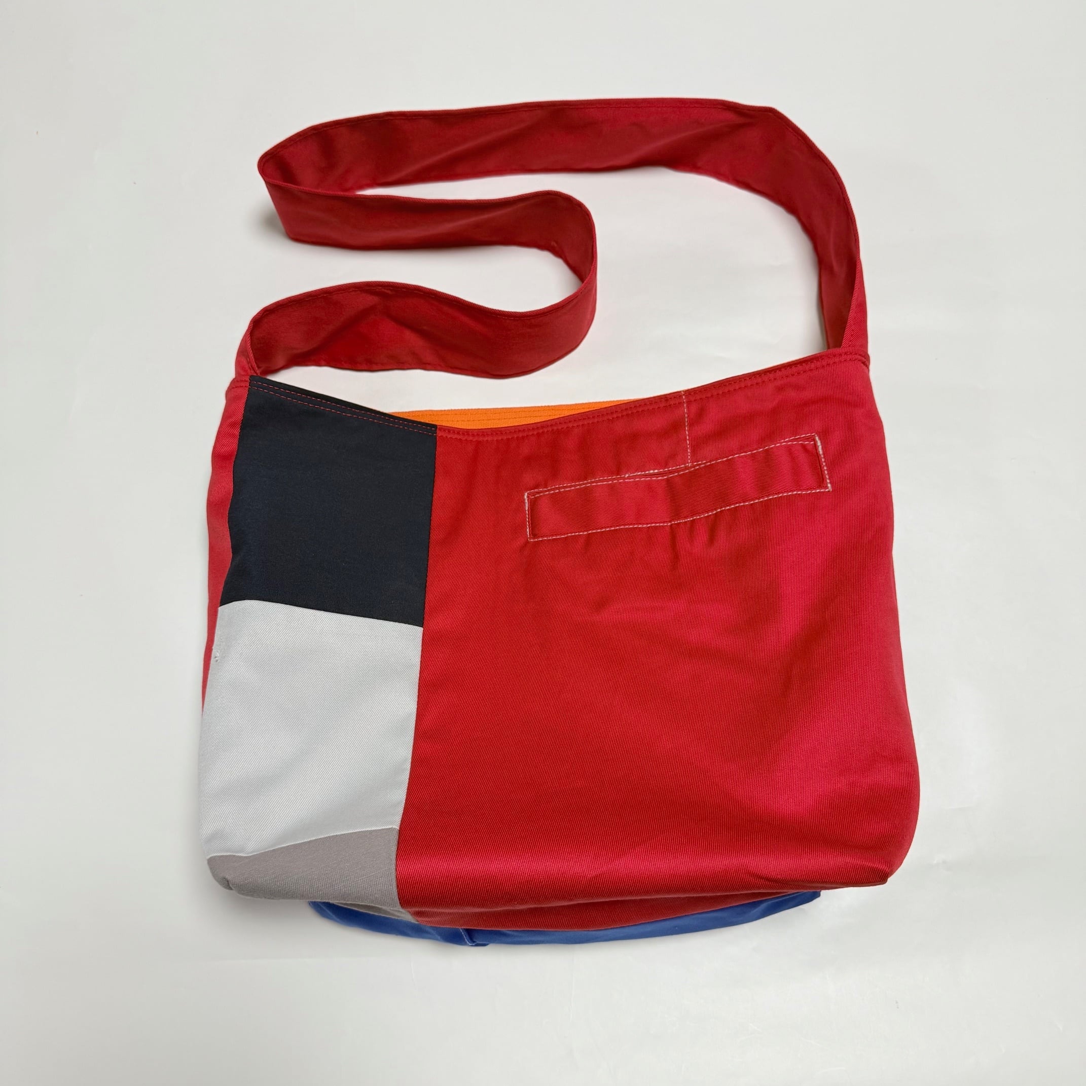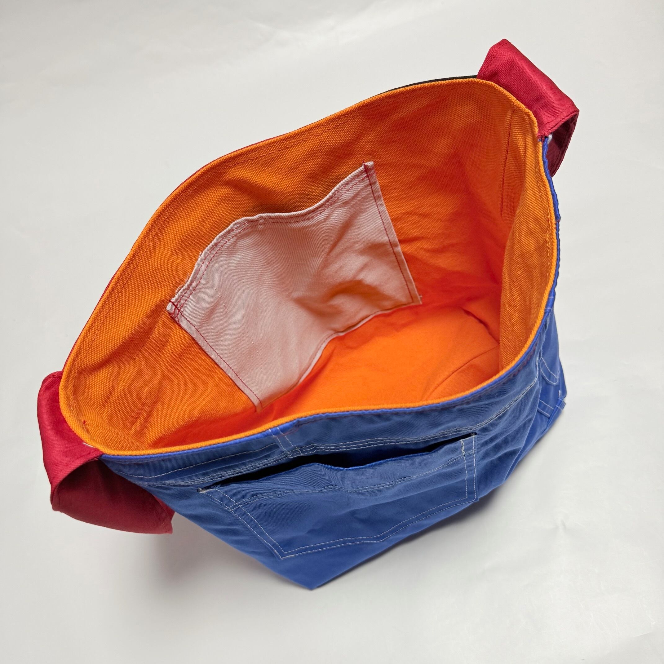 ・大型トートバッグ同様に、つなぎや作業着、レーシングスーツなどからリメイクしてています、もちろん裏地は厚手の頒布を使用しています、自立するトートバッグです。