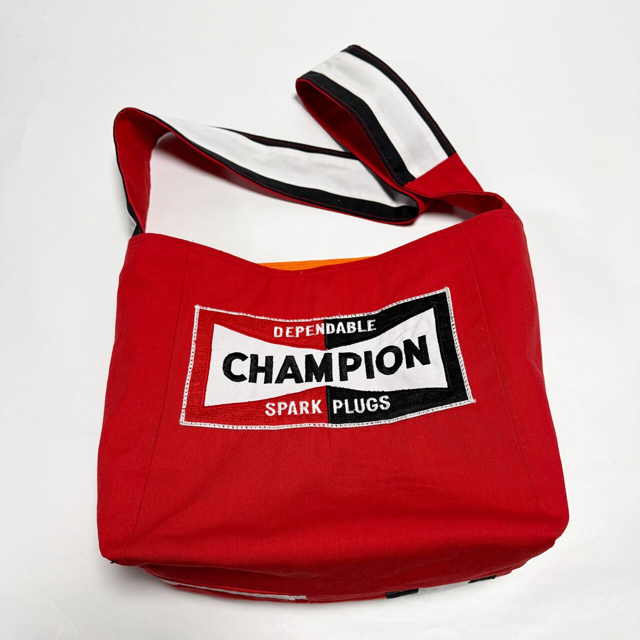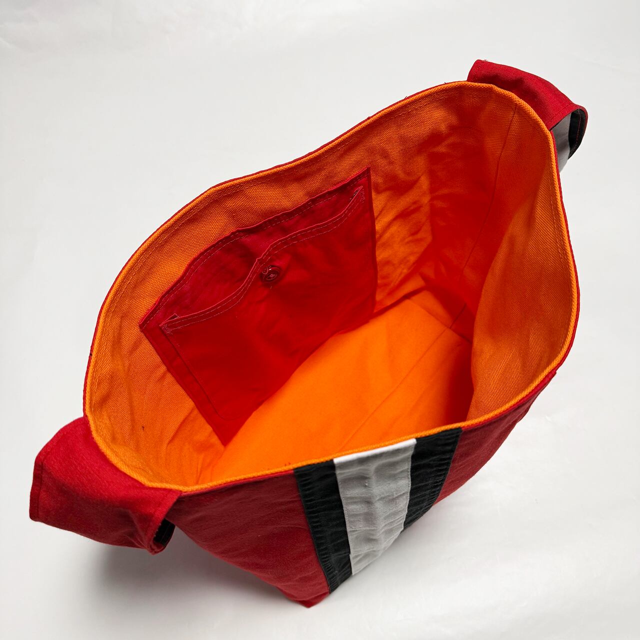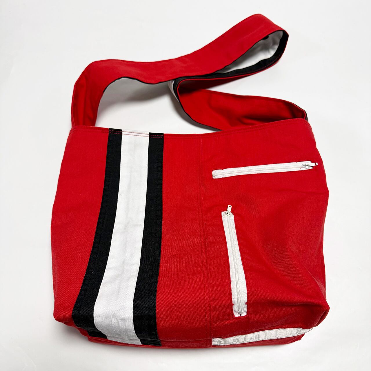 ・大型トートバッグ同様に、つなぎや作業着、レーシングスーツなどからリメイクしてています、もちろん裏地は厚手の頒布を使用しています、自立するトートバッグです。