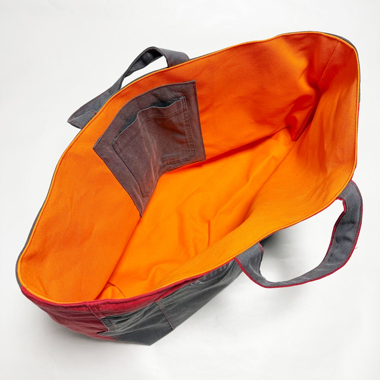 「もったいない」「再利用」「ひとつ使いましょう」「SDGs」などをコンセプトに。廃棄、不要になったツナギ、作業着、作業ズボン、古着屋さんに眠る衣服、その他生地類を丁寧に分解し、縫製の職人さんとクリエーターが再デザイン、大型のオリジナルトートバッグを完成させました。