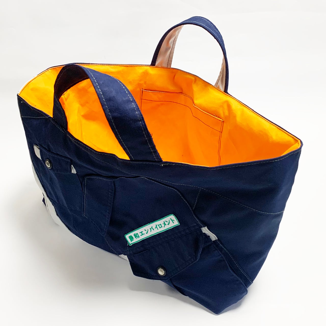 「もったいない」「再利用」「ひとつ使いましょう」「SDGs」などをコンセプトに。廃棄、不要になったツナギ、作業着、作業ズボン、古着屋さんに眠る衣服、その他生地類を丁寧に分解し、縫製の職人さんとクリエーターが再デザイン、大型のオリジナルトートバッグを完成させました。