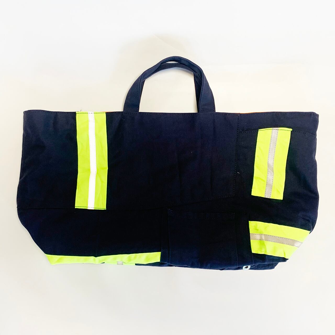 「もったいない」「再利用」「ひとつ使いましょう」「SDGs」などをコンセプトに。廃棄、不要になったツナギ、作業着、作業ズボン、古着屋さんに眠る衣服、その他生地類を丁寧に分解し、縫製の職人さんとクリエーターが再デザイン、大型のオリジナルトートバッグを完成させました。
