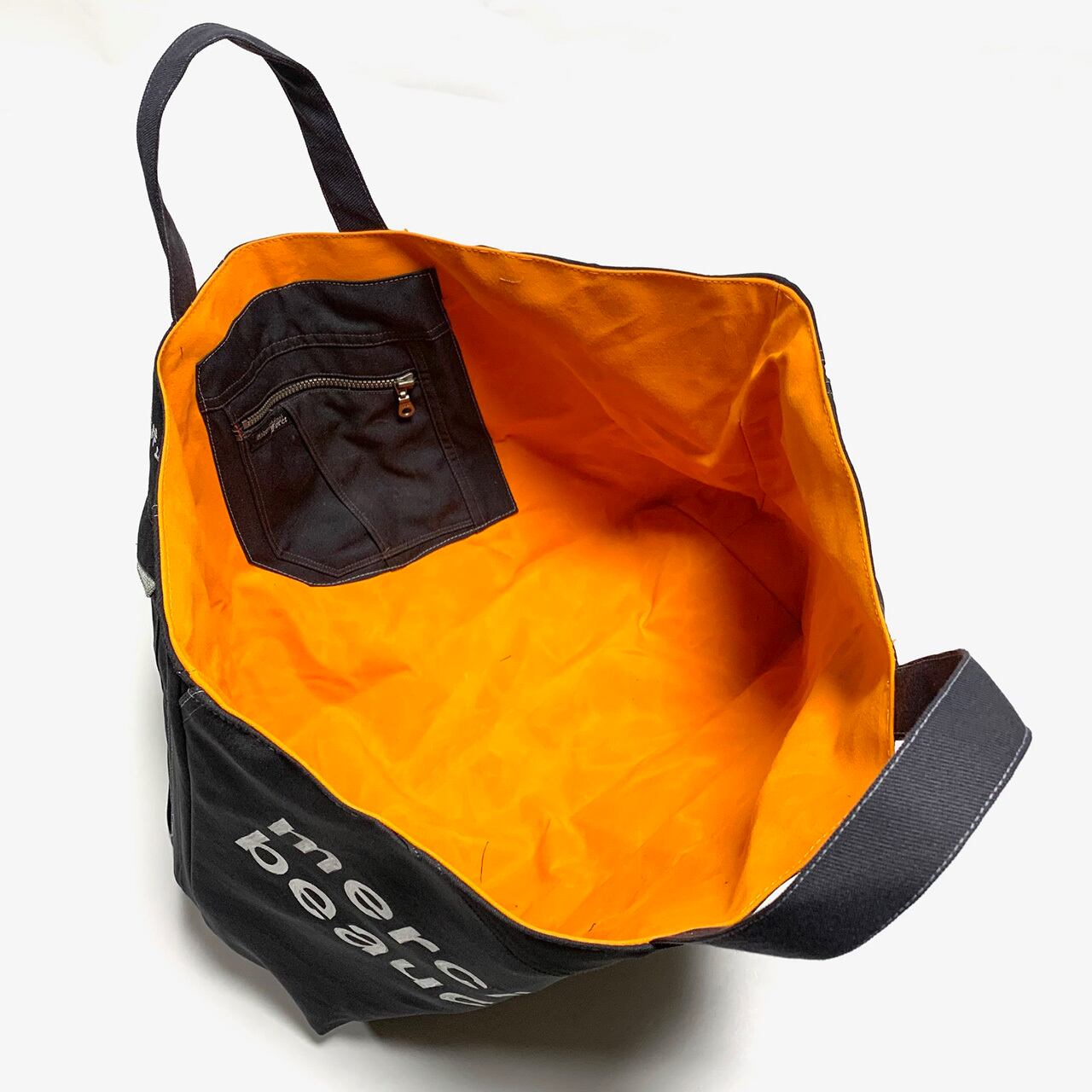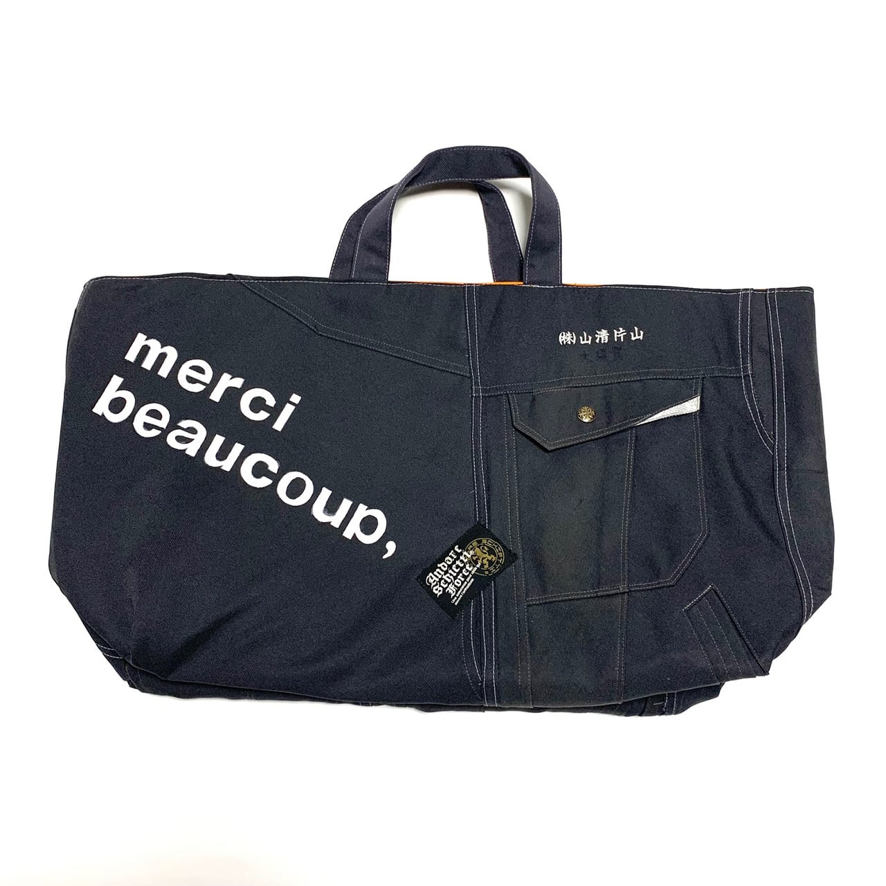 「もったいない」「再利用」「ひとつ使いましょう」「SDGs」などをコンセプトに。廃棄、不要になったツナギ、作業着、作業ズボン、古着屋さんに眠る衣服、その他生地類を丁寧に分解し、縫製の職人さんとクリエーターが再デザイン、大型のオリジナルトートバッグを完成させました。