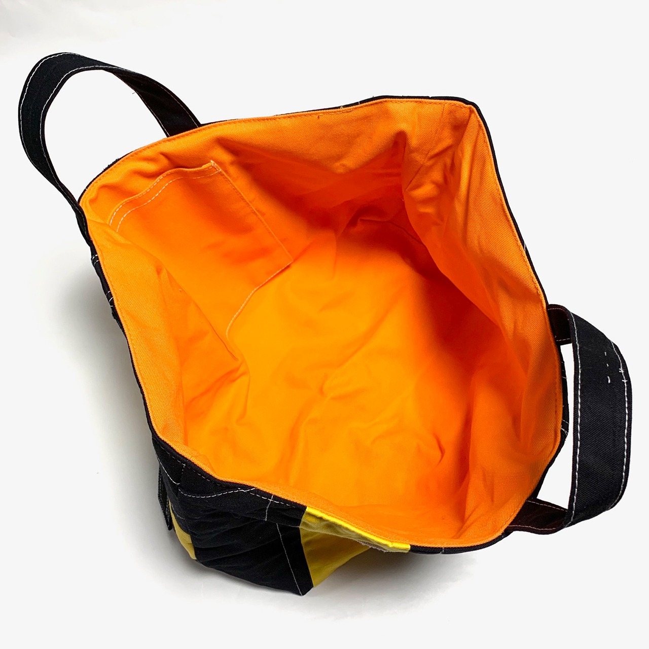 「もったいない」「再利用」「ひとつ使いましょう」「SDGs」などをコンセプトに。廃棄、不要になったツナギ、作業着、作業ズボン、古着屋さんに眠る衣服、その他生地類を丁寧に分解し、縫製の職人さんとクリエーターが再デザイン、大型のオリジナルトートバッグを完成させました。