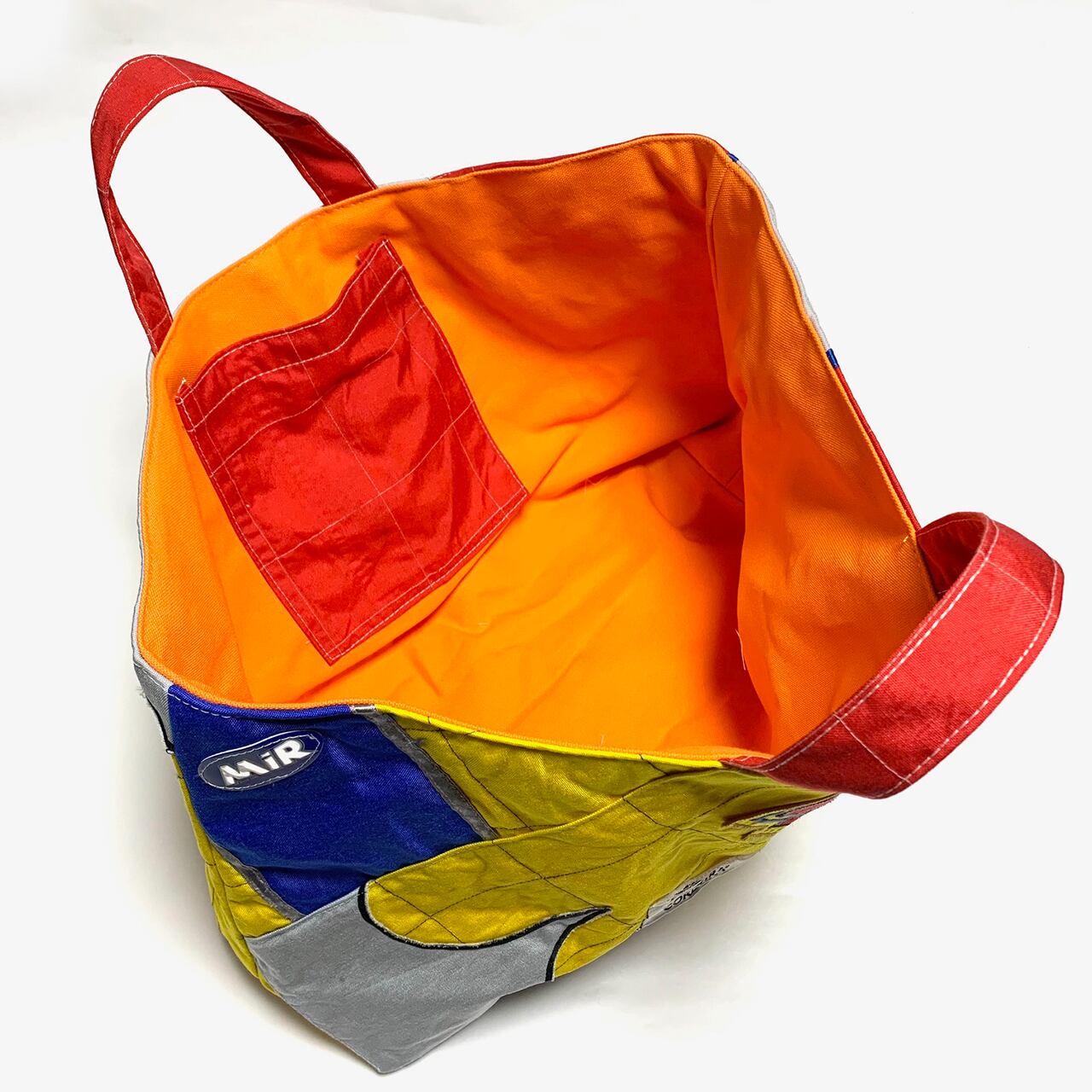 「もったいない」「再利用」「ひとつ使いましょう」「SDGs」などをコンセプトに。廃棄、不要になったツナギ、作業着、作業ズボン、古着屋さんに眠る衣服、その他生地類を丁寧に分解し、縫製の職人さんとクリエーターが再デザイン、大型のオリジナルトートバッグを完成させました。
