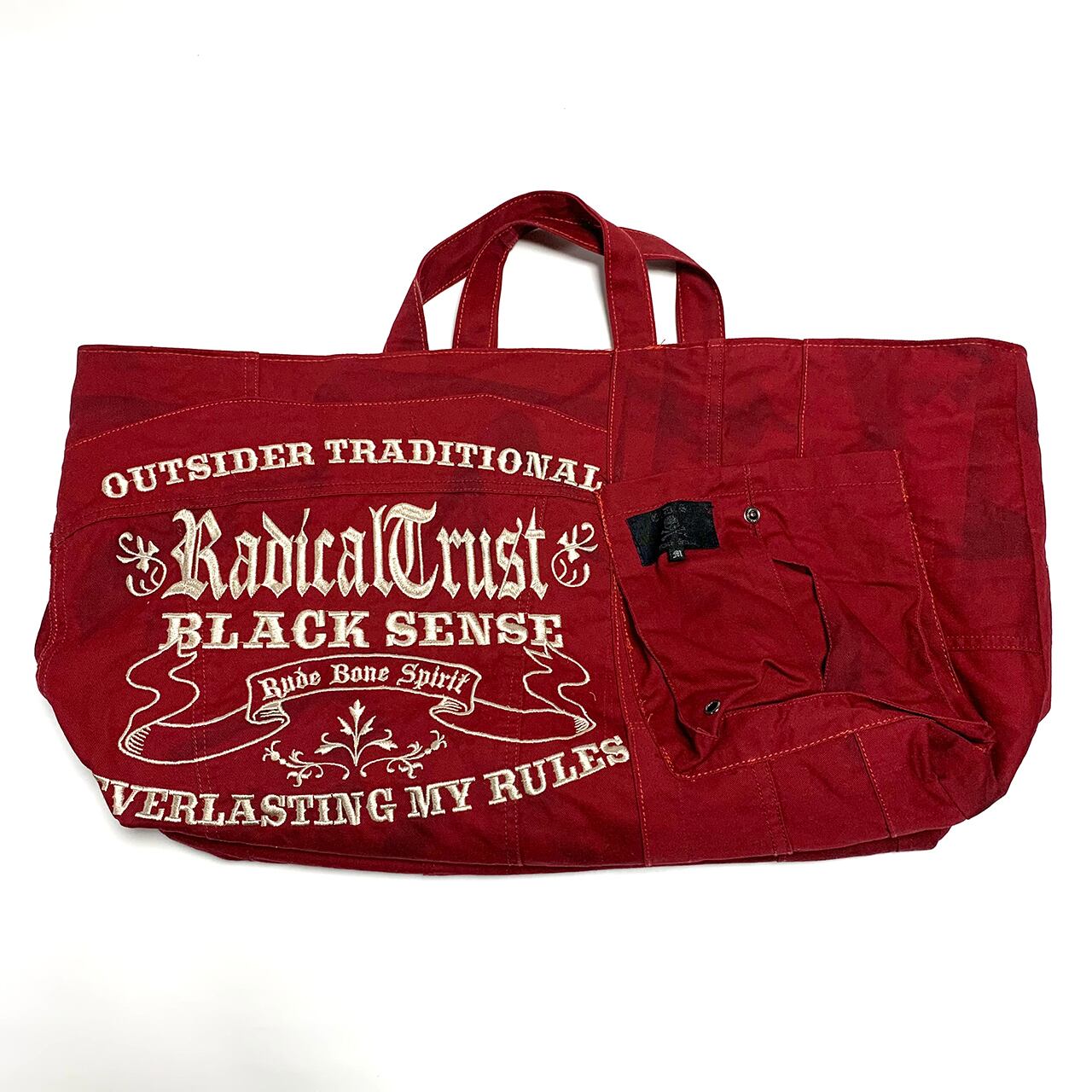 「もったいない」「再利用」「ひとつ使いましょう」「SDGs」などをコンセプトに。廃棄、不要になったツナギ、作業着、作業ズボン、古着屋さんに眠る衣服、その他生地類を丁寧に分解し、縫製の職人さんとクリエーターが再デザイン、大型のオリジナルトートバッグを完成させました。