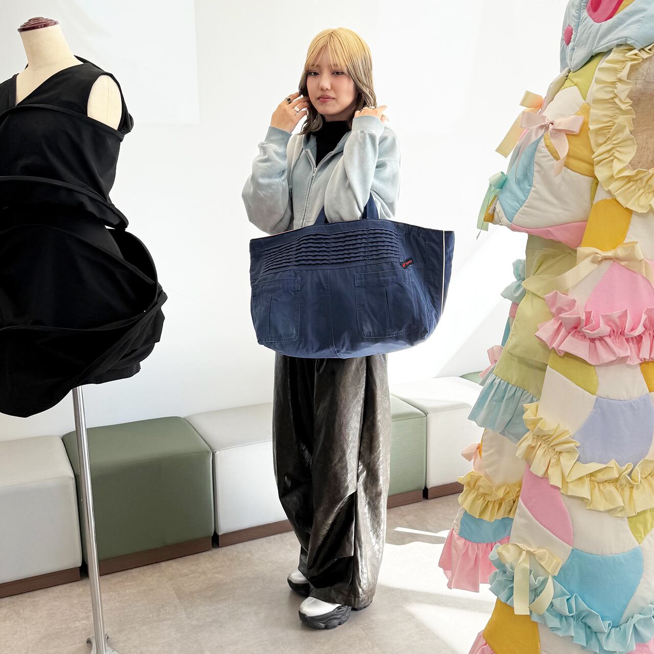 「もったいない」「再利用」「ひとつ使いましょう」「SDGs」などをコンセプトに。廃棄、不要になったツナギ、作業着、作業ズボン、古着屋さんに眠る衣服、その他生地類を丁寧に分解し、縫製の職人さんとクリエーターが再デザイン、大型のオリジナルトートバッグを完成させました。